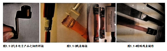 熔接完成兩塊不銹鋼間的連接。無論需不需要外加材料參與,此類焊接都需要高溫條件,不適合 PCBA焊接 工藝。如圖1.1-2汽車電子產(chǎn)品之銅件焊接。此結構件如果使用銅塊以CNC 加工中心一體成型,成本太高、不 符合市場需求。如果使用銅條沖壓折彎成型,外加銅柱攻絲成型,組裝成最終結構件則經(jīng)濟效益提高很多。問題 是攻絲后的銅柱與銅條間的連接如何完成?使用螺絲方式連接,銅條太薄;使用軟釬焊接,結構強度不足,此 時高溫熔接便是首選方案。常見的高溫熔接技術如電阻焊,利用導體壓緊施以瞬間大電流熔化本體材質完成熔 接。另一個常見的熔接是超聲熱壓焊接,常用于高端線束與端子之間的焊接,如銅導線與銅端子熔接,銅導線與 鋁端子熔接,圖1.1-3線束熔接。此類連接技術在高端精密裝配中應用成熟,特別是大電流、大電壓線束制作與 焊接領域使用廣泛。部分線束制作成的超大電流應用場景會將線束及銅線辮直接壓合成規(guī)則形狀以被裝配使用圖 1.1-4特殊線束制作,也是使用加壓熔接方式完成。