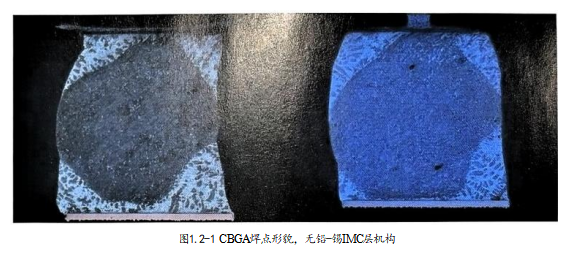 溶接,就是溶化焊接。常見的有鉛焊接、無鉛焊接工藝中,使用軟釬焊料加熱至熔化,熔化的焊料與被焊接 母材接觸,母材材質溶解進入液態(tài)焊料,最終形成焊點。最典型的就是有鉛焊接工藝中CBGA的焊接,圖1.2- 1CBGA 焊點。常見CBGA 使用的高鉛核成份為9010,即90%的鉛Pb,10% 的錫Sn。鉛與錫是無限互溶體 (也有同仁稱謂無限固溶體),也就是錫中添加鉛,從純錫到接近純鉛,比率不限制。有鉛共晶焊料為Sn63%- Pb37%, 焊料熔化呈液態(tài)時與9010的高鉛核接觸,高鉛核錫鉛與液態(tài)錫鉛無限互溶,產(chǎn)生原子間力結合,冷卻 后形成焊點。需要說明的是,此種焊接并不生成新的錫-鉛合金如 SnxPby, 也就是業(yè)界常說的金屬間化合物。