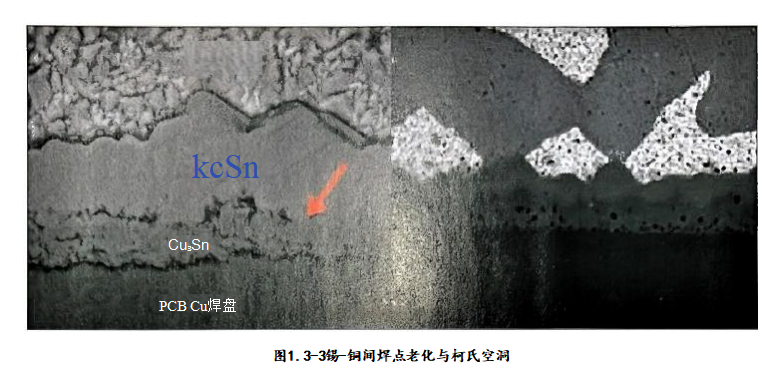 PCBA 焊接,從焊點結構上講可以分為PCB 端焊接與元器件端焊接。 PCB 表面處理有很多種,常見的有 OSP (有機保焊膜、裸銅板、Entek)、沉 銀(I-Ag)、 沉 金(ENIG)、 沉 錫(I-Sn)、 噴錫(HASL、 熱風整平)、 選化板(選擇性化學鎳金、選擇性化學鎳把金)、化學鎳把金(ENEPIG) 等。電鍍鎳金一般不用于直接焊接,原 因是金層過厚,焊點存在金脆化風險。雖然PCB 表面處理有許多種類,但焊接后形成的 IMC 卻只有兩類,即錫- 銅間焊接、錫-鎳間焊接。OSP 板、沉銀板、沉錫板、噴錫板四者焊接形成的 IMC相同,都是Cu?Sn? 、Cu?Sn, 焊接正常的焊點切片圖呈現(xiàn)典型的扇貝狀形貌,圖1.3-1錫-銅間焊接 IMC 形貌。當焊點過度生長或老化后呈 層狀結構,圖1.3-2錫-銅間焊點過度生長老化形貌。焊點過度老化、或焊接不良時,位于IMC(Cu?Sn?) 底部的 Cu?Sn 層逐漸增厚,有時伴隨著明顯的納米級微空洞(柯氏空洞),圖1.3-3錫-銅間焊點老化與柯氏空洞。關于焊點老化失效機理與控制方案,可以參考《產(chǎn)品失效機理與預防對策》 一書。書中對各種焊點失效機 理與控制方案有詳細闡述,以供參考。