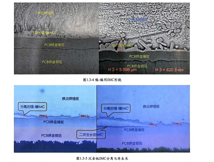 鎳層為柱狀結構,俗稱柱狀鎳。體現(xiàn)在焊點切片形貌上有所不同,特別是鍍層處理不良、有氧化腐蝕時特別明顯,圖1.3-7層狀鎳與柱狀鎳 IMC結構。