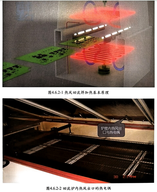 熱風(fēng)回流焊是當(dāng)今業(yè)界的主流,其基本原理是馬達(dá)帶動(dòng)風(fēng)扇(Blower) 吹風(fēng),經(jīng)過加熱絲(Heater) 變成 熱風(fēng),熱風(fēng)吹到PCB 表面,加熱元件、焊錫與PCB, 最終達(dá)成焊錫熔化焊接的目的,圖4.6.2-1熱風(fēng)回流焊加 熱基本原理。Reflow設(shè)備在爐膛內(nèi)出風(fēng)口安裝熱電偶,圖4.6.2-2回流爐內(nèi)熱風(fēng)出口的熱電偶。