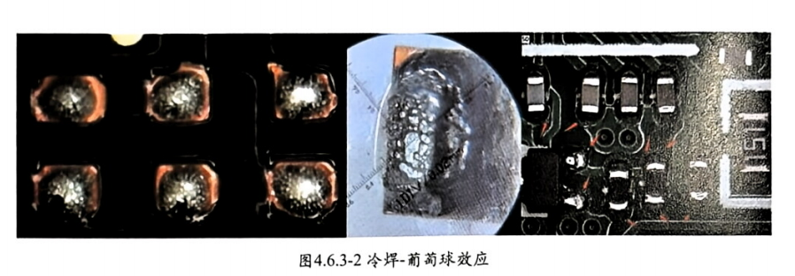 實際電子產(chǎn)品制造過程中,什么條件下需要使用氮氣爐,什么條件下只需要使用空氣爐呢?原則上產(chǎn)品上有 0201&更小尺寸的元件如01005,產(chǎn)品上有Pitch0.4mm 及更密間距IC 或連接器,如0.35mm pitch連接器、), 0.25mm pitch CSP、0.15mm pitch 裸芯片等,必須使用氮氣爐。原因是元件尺寸越小、印刷錫膏量越小,助焊劑含量越少,助焊劑越容易揮發(fā)失效,不使用氮氣防護則越容易出現(xiàn)冷焊(葡萄球效應(yīng),圖4.6.3-2冷焊-葡萄 球效應(yīng))現(xiàn)象。所以便攜式電子產(chǎn)品如手機、手表、手環(huán)、耳機、眼睛、平板電腦等小尺寸 PCBA 都必須配置氮 氣制程。另一個使用氮氣的要求源于焊點外觀的亮度。如果要求焊接后焊點呈現(xiàn)金屬色澤明亮,則需要使用氮氣 工藝焊接。如軍工、航天、艦船、軌道交通、醫(yī)療電子、服務(wù)器等高可靠性電子產(chǎn)品。