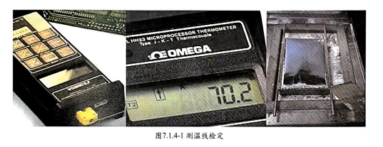 熱電偶制作后,需使用測(cè)溫儀對(duì)每根測(cè)溫線作檢測(cè),以確定其功能正常,溫度測(cè)量準(zhǔn)確。一般采用校準(zhǔn)后的 小錫爐將焊錫熔化,小錫爐設(shè)定溫度在250℃,熱電偶熔接端插入小錫爐,另一端接插于溫度測(cè)試儀,讀取實(shí)際 測(cè)試溫度以判定測(cè)溫線合格與否。此方案也常用于工廠購(gòu)置測(cè)溫線進(jìn)料檢驗(yàn)。圖7.1.4-1測(cè)溫線檢定。