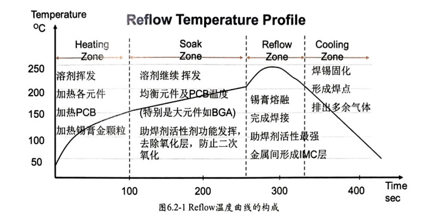 回流焊溫度曲線反饋的是進入回流焊設(shè)備的物體溫度隨著時間變化的過程。以最常用的RSS溫度曲線為例, Reflow 溫度曲線分為四大部分:Preheating Zone(溫度爬升區(qū))、Soaking Zone( 均 溫 區(qū) ) 、Reflow Zone(回流焊接區(qū))、 Cooling Zone(冷卻區(qū)),圖6 . 2 - 1 Reflow溫度曲線的構(gòu)成。
